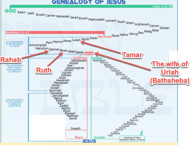 We see in these genealogies that Jesus’ parents both descended from David, also fulfilling prophecy (Psalm 132:11, Jeremiah 23:5-6). What is fascinating about Matthew’s list is that he includes four women, all of whom were likely Gentiles (non-Jews), and at least three of whom are known to have been involved in some kind of immorality. Instead of leaving them out, which would have been easier, by listing these women Matthew proudly shows that Jesus is both our God and Redeemer, full of grace and truth, who came to love and save sinners. These four women became the mothers of our King and Savior, Jesus Christ.